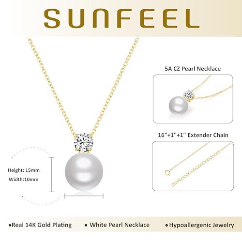 sought-after ! SUNFEEL 10MM Single Pearl Necklaces for Women, 925 Sterling Silver 14K Gold Plated Pearl Pendant Necklace Inlaid Cubic Zirconia Gift for Mom Wife Girlfriend Bride Wedding Dainty Jewelry, 16+2''