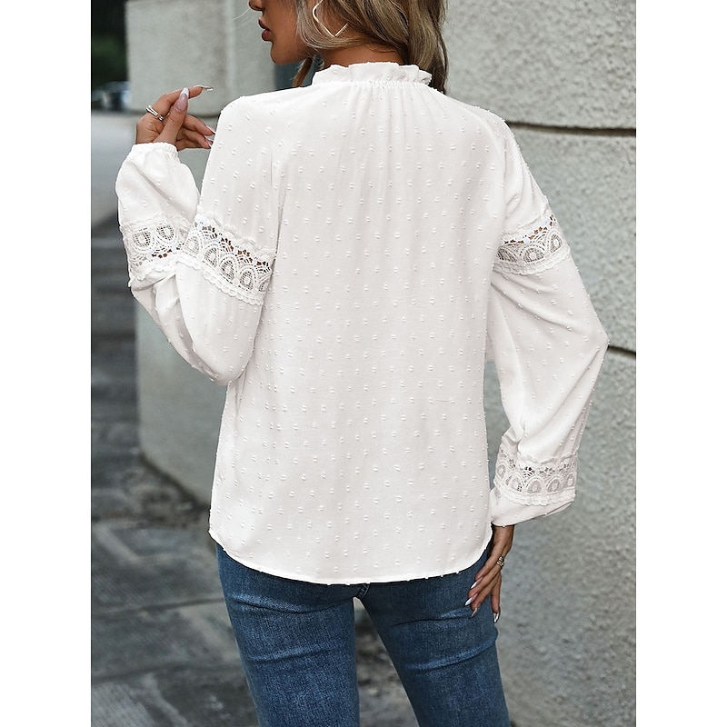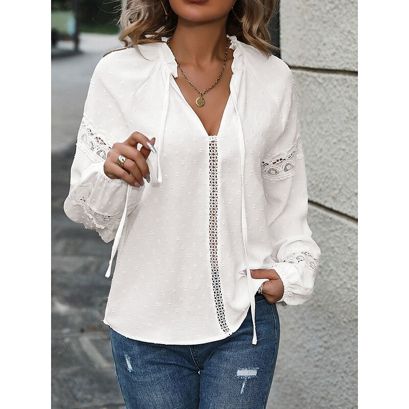 HOT ! Women's White Elegant Lace Tops Eyelet Blouse Casual Solid Color Tie Front Lace Long Sleeve Regular Tops Notched Neck Daily White Romantic Petite Tops Summer Holiday Wear Semi Formal Blouses