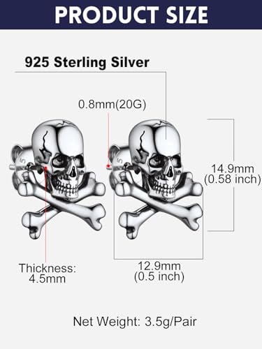 More information about Bandmax 925 Sterling Silver Skull Stud Earrings Hoop Earrings for Women Men Punk Gothic Halloween Skull Skeleton Earring Studs Hoops