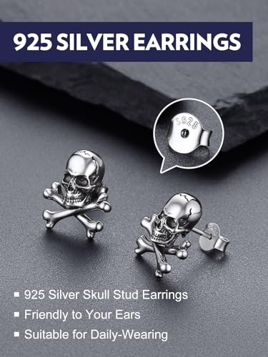 Bandmax 925 Sterling Silver Skull Stud Earrings Hoop Earrings for Women Men Punk Gothic Halloween Skull Skeleton Earring Studs Hoops 3