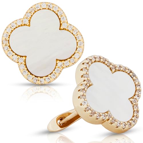 Four Leaf Clover Earrings 18K Gold Plated with Black Agate or White Shell | Mother of Pearl & Cubic Zirconia | traditional English Lock | Tarnish-Resistant Jewelry for Women