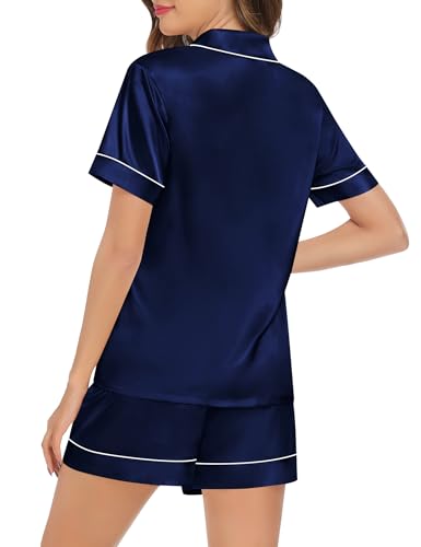 SWOMOG Couples Matching Pajamas Set Satin Short Sleeve Button Down Tops Silk Shorts Pj Lounge Set Soft Sleepwear 3