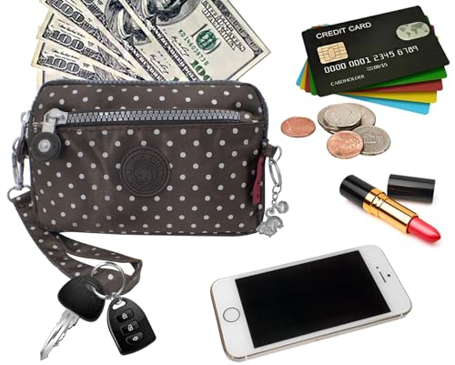 HOT ! Polka Dot Wristlet Wallet Clutch Purse for Woman with 3 Zippers, Detachable Wristlet Strap, Water Repellent, Cell Phone Holder, Card, Coin, Cash, Cosmetic, Daily Essentials (Brown)