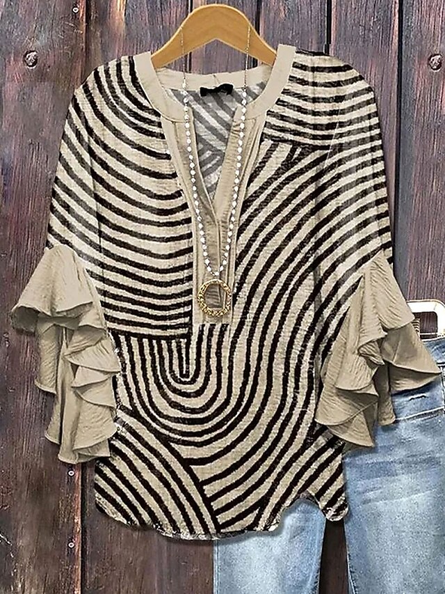 More information about Women's Blouse V Neck Graphic Striped Daily Stylish Casual 3/4 Length Sleeve Regular Tops Daily Holiday Vacation Wear Print Blue Purple Green Khaki Summer Spring