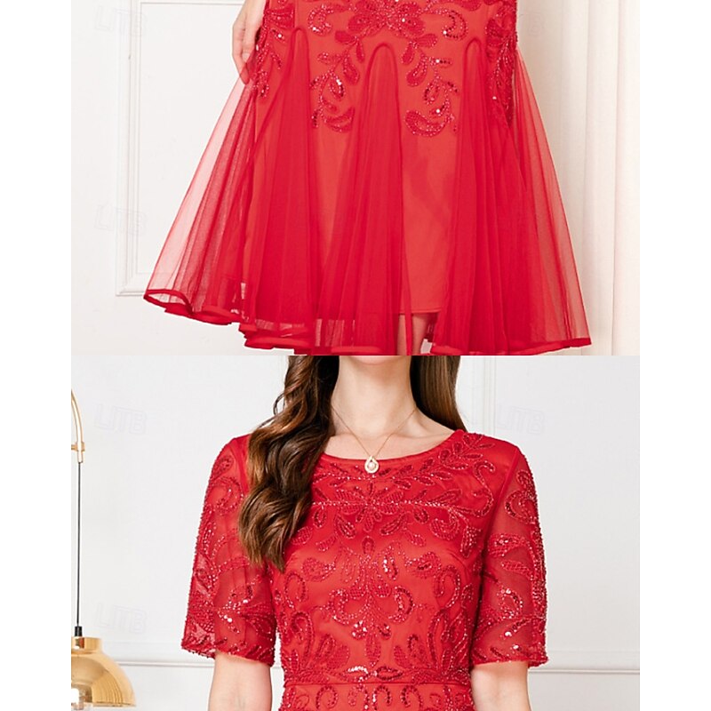 More information about A-Line Beaded Dress Mother of the Bride Elegant Vintage Party V Neck Floor Length Lace Beaded Sequin Lace Short Sleeve with Flare