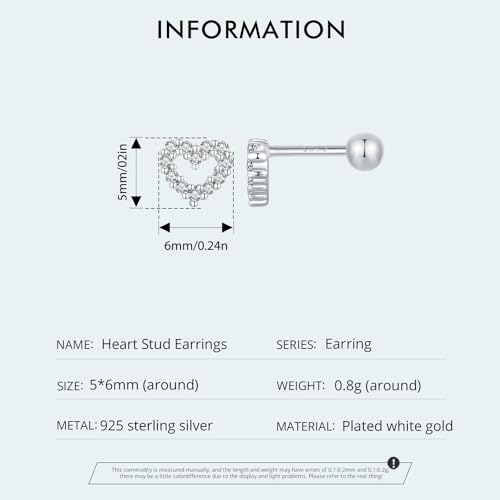 Kokoma 18G Love Heart Sterling Silver Earrings Hypoallergenic for Women Girls Cubic Zirconia Cartilage Tragus Piercing Earrings Post Screw Back Small Ear Jewelry 6