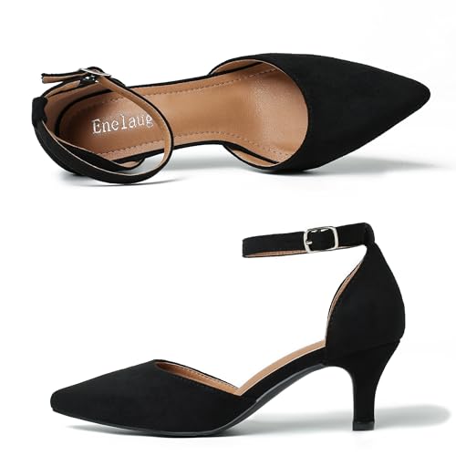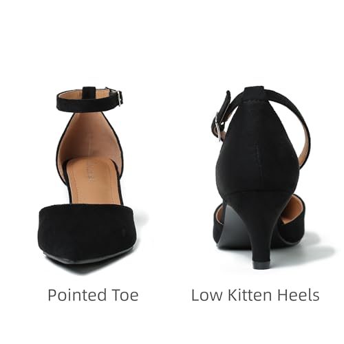 • KITTEN HEELS FOR WOMEN MATERIAL: Microfiber Pu/ Suede upper, soft comfortable lining and padded insole, non-slip rubber outsole, ankle strap design of low kitten heel pumps easy to walk in. Closed toe heels for women with classic pointed toe comfortable heels for women.