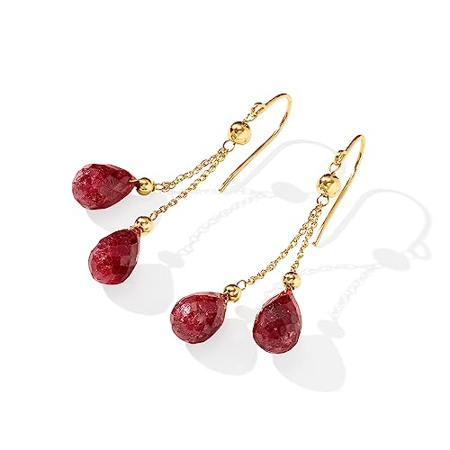 • 14KT YELLOW GOLD AND RUBIES — 15.00 ct. t.w. ruby and bead double drop earrings in 14kt yellow gold. Teardrop-shaped rubies. 3-4mm 14kt yellow gold beads. Suspend from 1.1mm rope chains. Polished finish. 1 7/8 in. hanging length, 3/8 in. wide. Earwire backings.