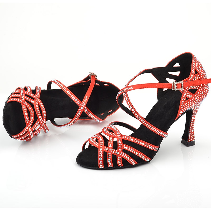 More information about Women's Latin Dance Shoes Salsa Shoes Dance Shoes Performance Indoor Glitter Crystal Sequined Jeweled Heel Peep Toe Buckle Cross Strap Adults' Almond Black Red
