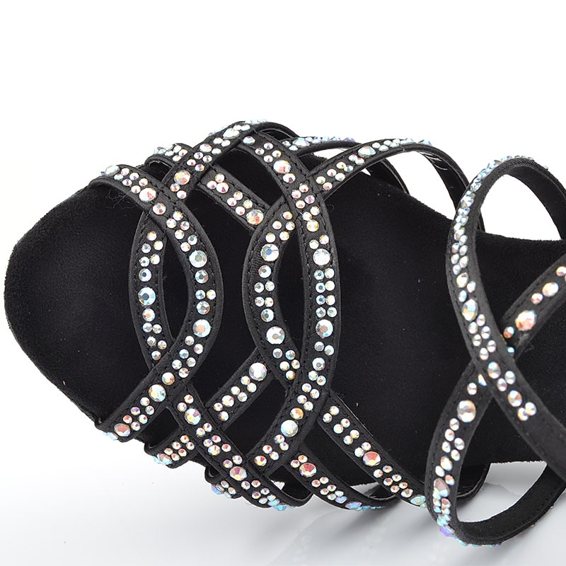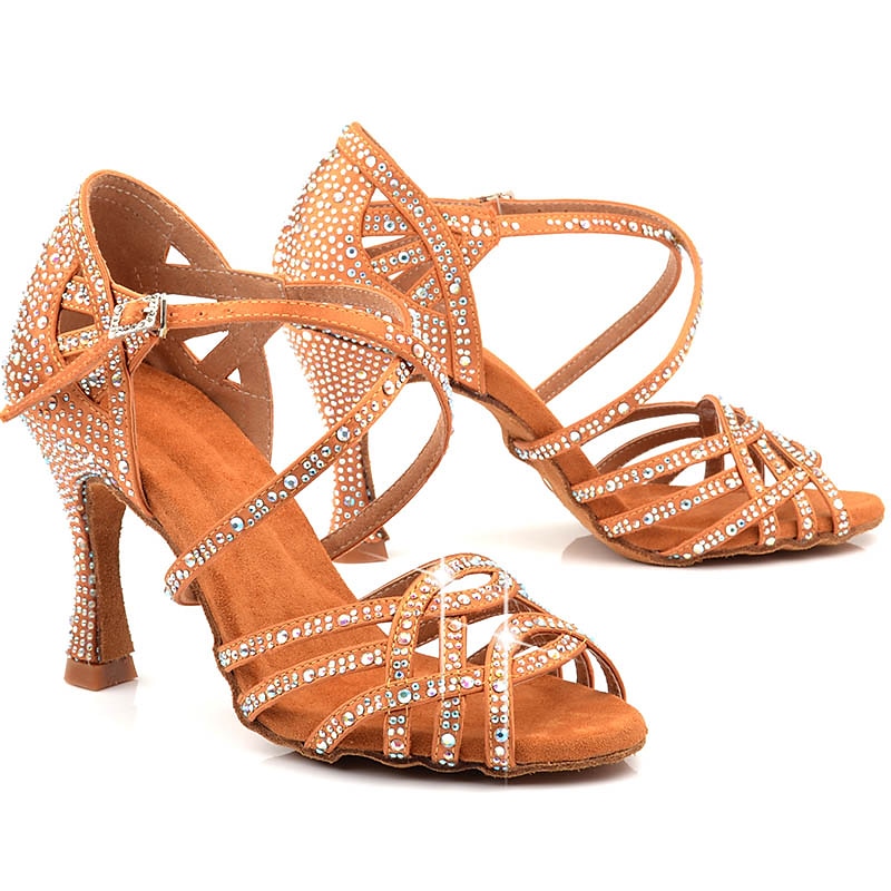 Highlights [Fabric and Materials] : Crafted from sparkling glitter and satin, these women's Latin dance shoes feature a luxurious suede lining that ensures comfort during extended wear. The high-quality materials give these shoes a touch of elegance and sophistication, perfect for making a statement on the dance floor. [Style and Fit] : Designed in a graceful heel style with an open peep toe, these shoes have a heel height between 3 to 4 inches, providing the perfect balance of height and stability. The moderately high Cuban heel offers a flattering silhouette that elongates the legs without compromising comfort. [Design Highlights] : These dance shoes boast a glamorous design with rhinestone embellishments across the slender cross straps, adding a stunning sparkle to each step. The secure buckle closure ensures a snug fit while enhancing the overall elegance of the shoe. The jeweled accent on the heel further elevates the shoe’s aesthetic, making it a standout piece. [Occasions] : Ideal for indoor performances and special occasions such as weddings, parties, and evening events, these shoes are perfect for anyone looking to add a touch of glamour to their ensemble. Their elegant and functional design makes them a versatile addition to any dancewear collection. [Size Range] : Available in a variety of sizes ranging from US5 to US9.5-10, these shoes are designed to fit comfortably and are true to size. Select your usual size for the best fit and dance the night away with confidence.