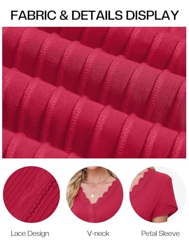 Fabric type: 97%Polyester; 3%ElastaneCare instructions: Machine Wash. Tumble dry on low heat (below 40°C/104°F)Origin: ImportedNeck style: V-NeckSoft Textured Fabric: Womens dressy tops and blouses are made of high-quality textured knitted fabric, stretchy and skin-friendly ensuring a pleasant dressing experienceLace V-neck Design: A distinctive v-neckline with lace in this women's blouse can highlight your neck and clavicle. This is an elegant and cute blouse that you must have in your wardrobePetal Sleeve Design: The short petal sleeves add a touch of romance to your ensemble while allowing for easy and unrestricted movementMatching: This short sleeve shirts can easily dress up a pair of work pants, jeans, or tucked into a skirt. No matter what body shape, you can wear different charmingOccasions: Cute tulip sleeve tops are suitable for most occasions, easily styled for daily wear/ work/ business/ casual dressy events/ date night/ trip vacation wear Perfect for everyday use. top-grade materials and excellent craftsmanship ensure long-lasting durability.