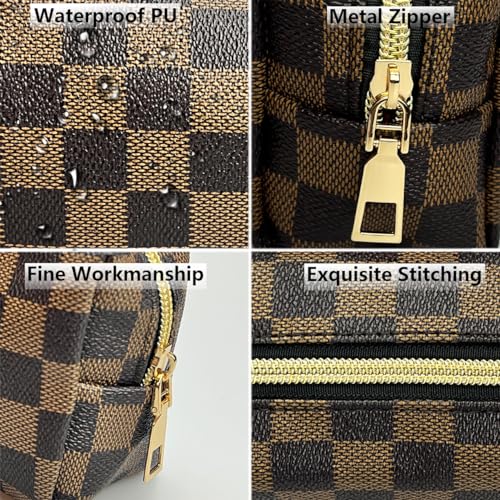 【Large Makeup Bag】This sophisticated brown checkered makeup bag ensures the safety and organization of your cosmetics. Its spacious design allows for versatile storage, perfect for jewelry, electronic accessories, digital cameras, toiletries, valuables, shaving kits, and more. Dimensions: 9.5 x 9.5 x 3.8 inches.【Spacious Pouch Bag】Measuring 9.4 x 7.1 x 3.1 inches, this large pouch bag features a roomy main compartment, a large zippered pocket, and two smaller inner pockets. It offers ample storage for travel essentials like toiletries, full-size brushes, glasses, cosmetics, makeup tools, lipsticks, eye shadows, and even men’s shaving kits.【Compact Makeup Brushes Bag】Designed for convenience, this cute bag is compact at 7.8 x 4.3 inches, making it perfect for on-the-go use. It easily fits into pockets, handbags, or backpacks for quick access. Ideal for storing makeup brushes or other small accessories, it adds a chic touch to your look and outfits.【Elegant and Retro Design】Featuring a vivid brown checkered pattern with a sophisticated golden zipper, this bag exudes vintage charm. Its timeless design complements any outfit, making it perfect for travel, parties, birthdays, weddings, and other special occasions.【Versatile & Giftable】Whether used as a makeup bag, toiletry bag, storage pouch, or cosmetic organizer, this bag is a practical and stylish choice. It’s an excellent gift for family, mothers, friends, and loved ones on Valentine’s Day, Thanksgiving, Christmas, or any occasion. Perfect for everyday use. excellent materials and excellent craftsmanship ensure long-lasting durability.