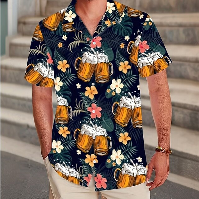 Men's Oktoberfest Beer Tropical Flowers Shirt Cuban Collar Shirt Button Up Shirt Short Sleeve Hawaiian Vacation Holiday Beach Wear Summer Spring Camp Collar Shirt 3D Print Dark Blue 7