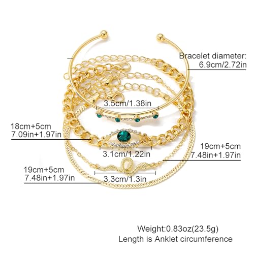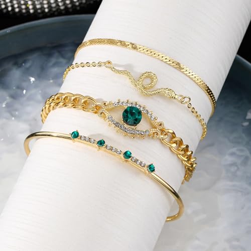Material: CopperMetal type: ZincClasp type: Lobster ClaspChain type: Snake ChainGem type: No gemstoneItem type name: Bangle Bracelets【Quality】: Gold Bracelet is made of high alloy steel with AAA+ cubic zirconia, 14K gold plate surface, nickle no-cost lead free and hypoallergenic, no harm to skin.【Design】: 4 Pcs include a sparkle crystal bangle, 3 pcs bracelet as big green evil eye around by full diamond、snake chain and long snake pendant, Complete your jewellery collection box.【Size】: Adjustable bracelet length 7.48+1.97extension, lobster clasp design, and open bangle, easily to adjust by yourself, wear one or stackable.【toasty Heart】: Dainty gold bracelet for women be put in a cool black half clear zipple package send to you or who you wanna make happy, suit for many occasion like daily party prom anniversary etc ready to shine.【WELCOME】17IF jewelry have 11 years of experience in R&D and production, Trust 17IF, What you see is worth more than the pic. This will be your surprise! Sparkling, elegant, only in 17IF!
