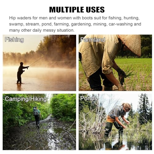 1. Lightweight PVC material: Our hip waders with boots are made from PVC material, providing a lightweight yet sturdy construction that long-lasting performance. Hip waders for men and women for fishing, hunting, swamp, stream, pond, farming, gardening, mining, car-washing and many other daily messy situation.2. Waterproof and leak-proof design: Designed to withstand slippery surfaces and muddy conditions, these hip boots feature a waterproof construction,High temperature heat sealing technology is used at the seams, that keeps your feet dry, provide comfort and allowing you to work confidently in various environments.3. snug and breathable: With their breathable design, these wading boots allow air circulation to keep your feet cool and comfortable throughout the day. Say goodbye to sweaty and uncomfortable feet, even during extended wear.4. Slip-resistant and abrasion-resistant: The non-slip and abrasion-resistant outsole provides remarkable traction on various surfaces, making these fishing boots for working in fields or other slippery terrains. You can confidently navigate through any terrain without worrying about slipping or getting injured.5. Adjustable strap for easy wearing: Equipped with adjustable straps, these boots can be easily tightened or loosened according to your preference, provide a secure and customized fit. Putting them on and taking them off is a breeze, saving you time and effort.