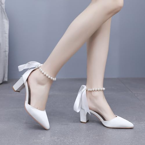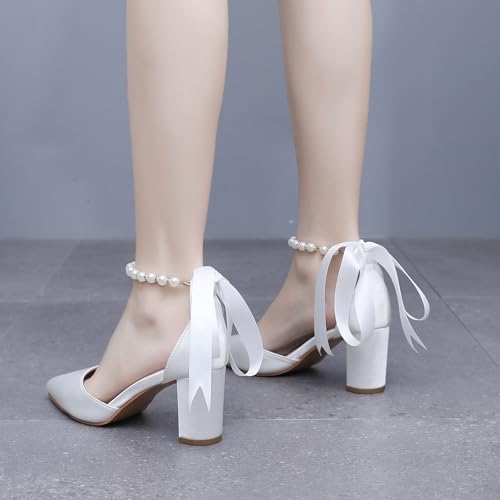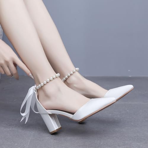 HOT ! Women's Ankle Strap Pumps with Pearls, Pointed Toe, 3" Heel, White
