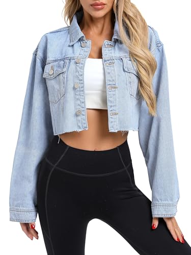 More information about Women's Cropped Denim Jacket, Button Down Long Sleeve Frayed Loose Oversized Jean Jacket Coat