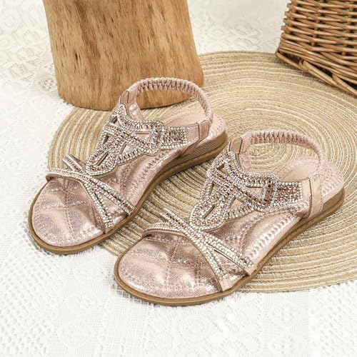 Girls Bohemian Rhinestone Sandals Kids Summer Beach Wedding Crystal Open Toe Flats Sandal with Elastic Ankle Strap 6