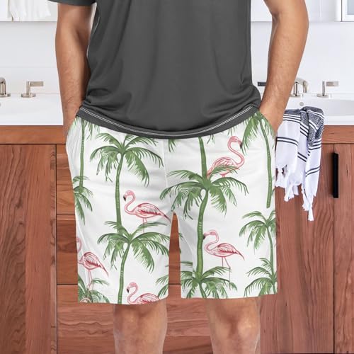 Flamingo Tropical Tree Pajama Bottom Shorts for Men silky Casual Sleep Lounge Shorts with Pockets S-XXL
