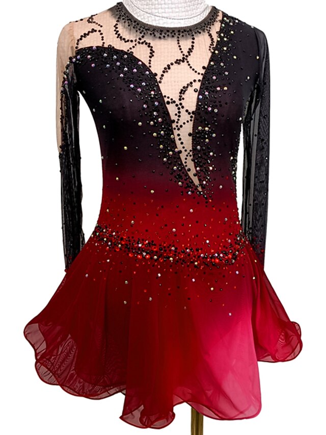 Figure Skating Dress Women's Girls' Ice Skating Dress Outfits Black / Red Black / Blue Open Back Asymmetric Hem Mesh Spandex High Elasticity Practice Competition Skating Wear Handmade Crystal 1