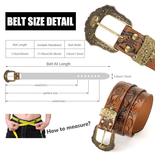 Women Vintage Floral-Carved-Leather-Belt Western-Country Cowgirl Belt with Metal Pin Buckle for Jeans Pants 28-38" Waist