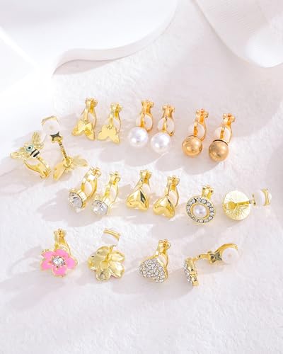 • 【WOMEN CLIP ON EARRINGS SET】:Get ready to fall in love with these adorable clip on earrings! We've got 18 pairs of gold clip on earrings for women. And the clip earrings feature different designs, like CZ, love knot, faux pearl, heart, butterfly, flower, clover, mouse, bee, ball and more, which are very popular with women alike.