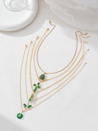 5Pcs Green Jade Buddha Pendant Necklace Set 18K Gold Plated Zircon Chain Lucky Buddha Necklace for Women Cross Dragon Dragonfly Round Pendant Necklaces for Women Jewelry 5