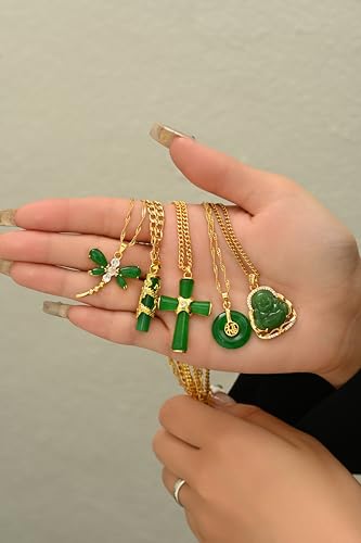 5Pcs Green Jade Buddha Pendant Necklace Set 18K Gold Plated Zircon Chain Lucky Buddha Necklace for Women Cross Dragon Dragonfly Round Pendant Necklaces for Women Jewelry 6