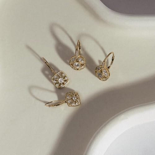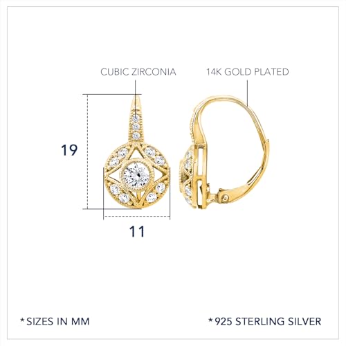 14K Plated Yellow Gold, Platinum Plated 925 Sterling Silver Leverback Antique Earrings for Women | 1 Carat Round Cut Cubic Zirconia CZ Simulated Diamond