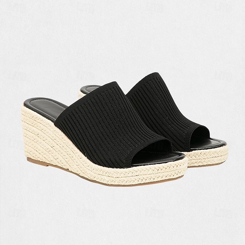 Highlights [Fabric and Fit] : Featuring a stretchy black knit upper, these women's sandals offer a snug and adaptable fit that molds to the shape of your foot, ensuring comfort throughout the day. The open-toe design enhances breathability, making these sandals an ideal choice for warm summer days. [Design Elements] : The midsole boasts a beautifully woven jute material, exuding an elegant espadrille style. These sandals feature a wedge heel that provides additional height while ensuring comfort and stability. The durable rubber outsole ensures excellent traction and grip, perfect for a variety of terrains. [Occasions] : Versatile in style, these wedge sandals are suitable for daily wear, whether you're attending casual gatherings or semi-formal events. Their combination of fashion and functionality makes them ideal for summer outings and leisurely strolls. [Design Highlights] : These sandals, with their espadrille wedge design, offer a chic and sophisticated look. The sleek knit material and the woven jute detailing offer a modern twist to classic summer footwear. [Size Range] : Available in a comprehensive range of sizes, from US5 to US13 (EU35-43 / UK3-11), ensuring a perfect fit for a variety of foot sizes.