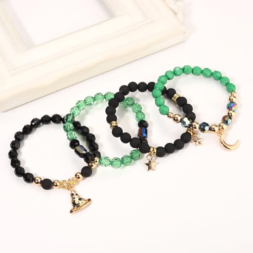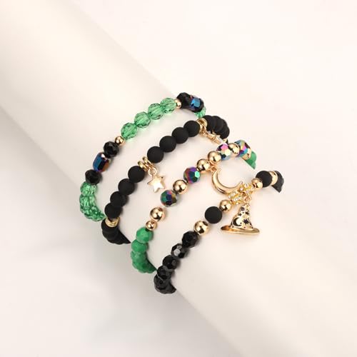 • Transport yourself to the magical world with this enchanting crystal green elphaba bracelets. This witch friendship bracelets set includes 4 unique black and green crystal beaded bracelets, which adorned with a witch hat and stars. beautifully captures the spirit of Elphaba, adding a touch of fairy tale elegance to any outfit
