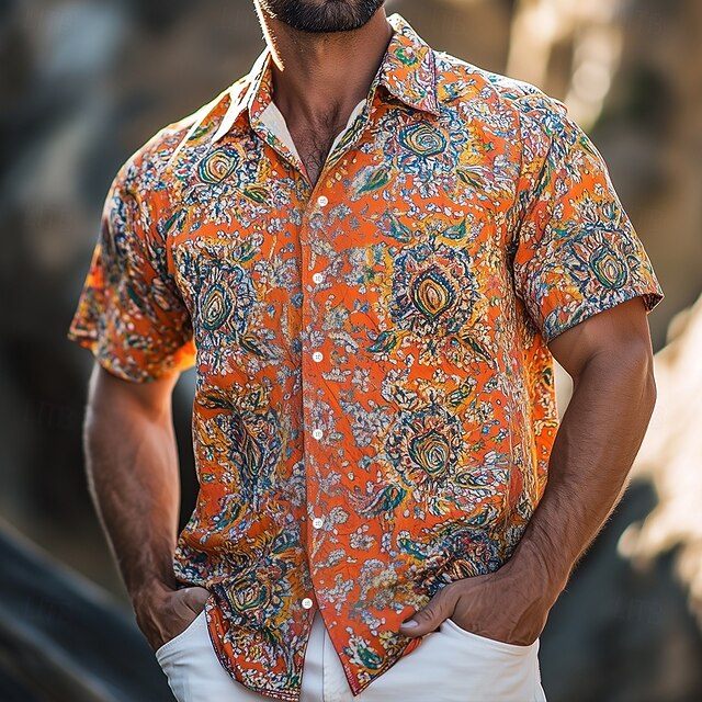 Men's Floral Print Indian Boho Shirt Summer Hawaiian Shirt Button Up Shirt Short Sleeve Hawaiian Vacation Holiday Beach Wear Summer Spring Turndown 3D Print Collared Shirts Orange Khaki 6