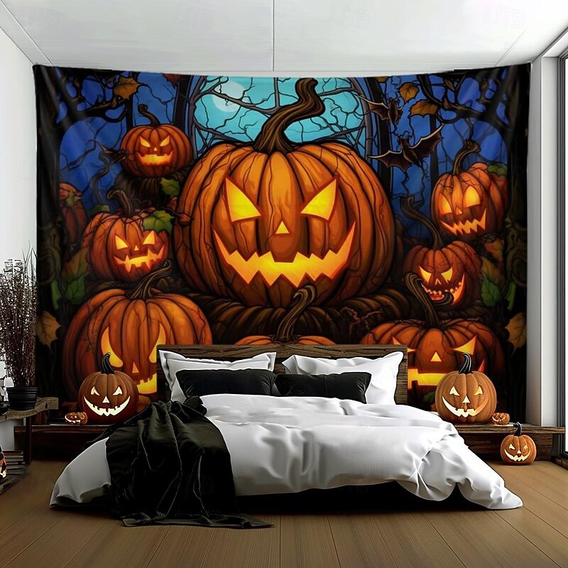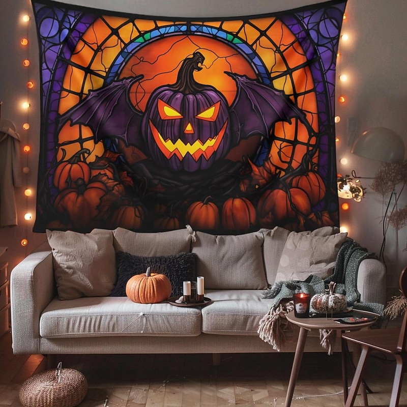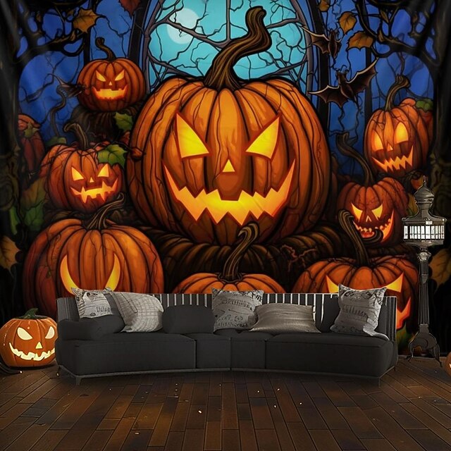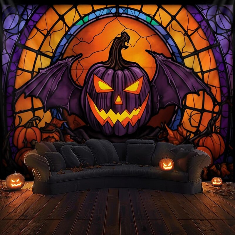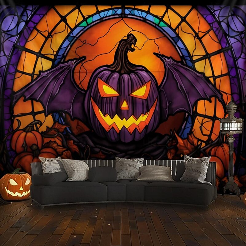 HOT ! Halloween Decorations Hanging Tapestry Stained Glass Pumpkin Bat Wall Art Large Tapestry Mural Decor Photograph Backdrop Blanket Curtain Home Bedroom Living Room