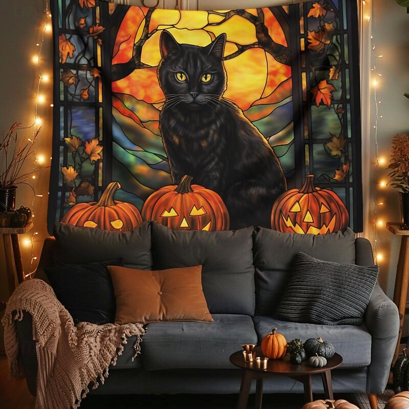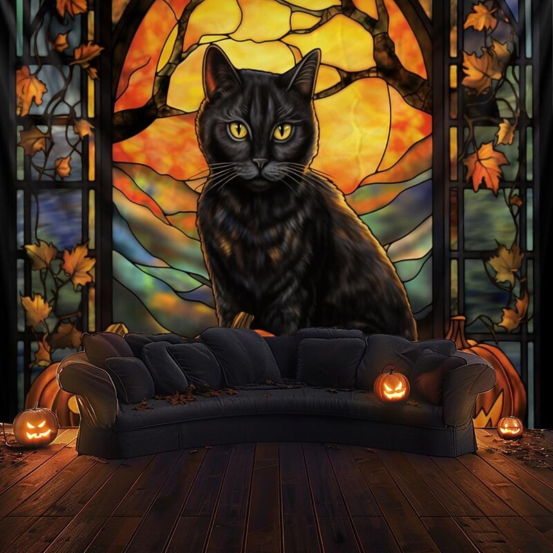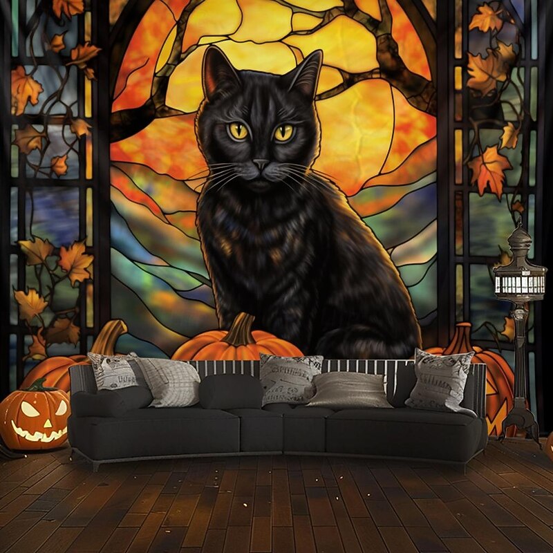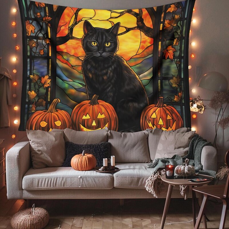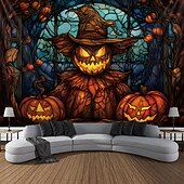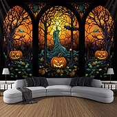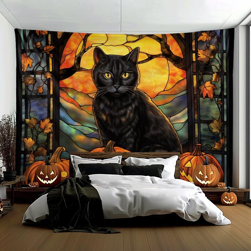 HOT ! Halloween Decorations Hanging Tapestry Stained Glass Pumpkin Bat Wall Art Large Tapestry Mural Decor Photograph Backdrop Blanket Curtain Home Bedroom Living Room