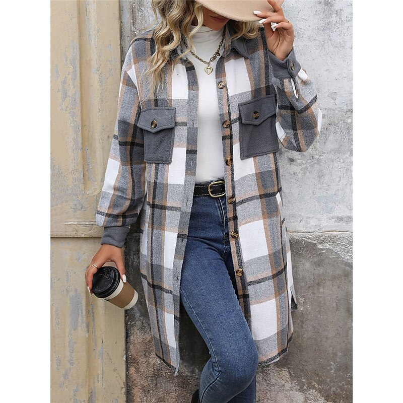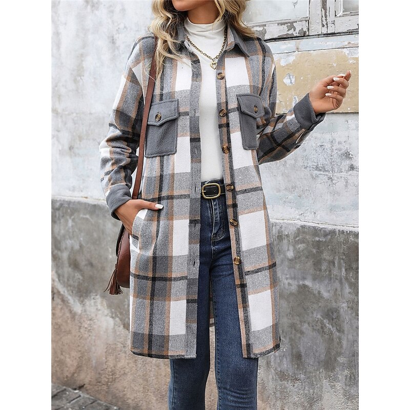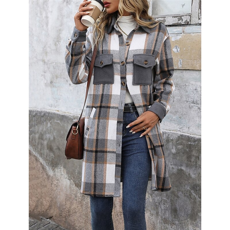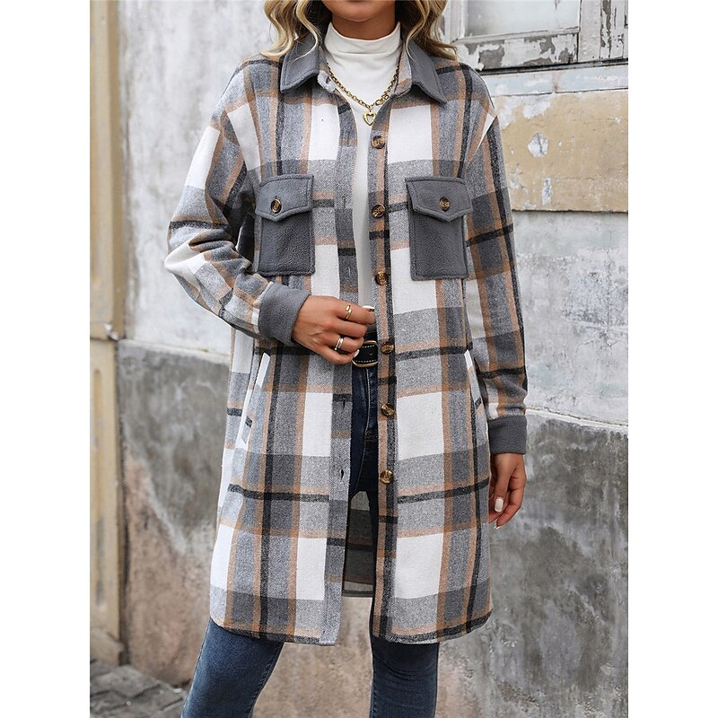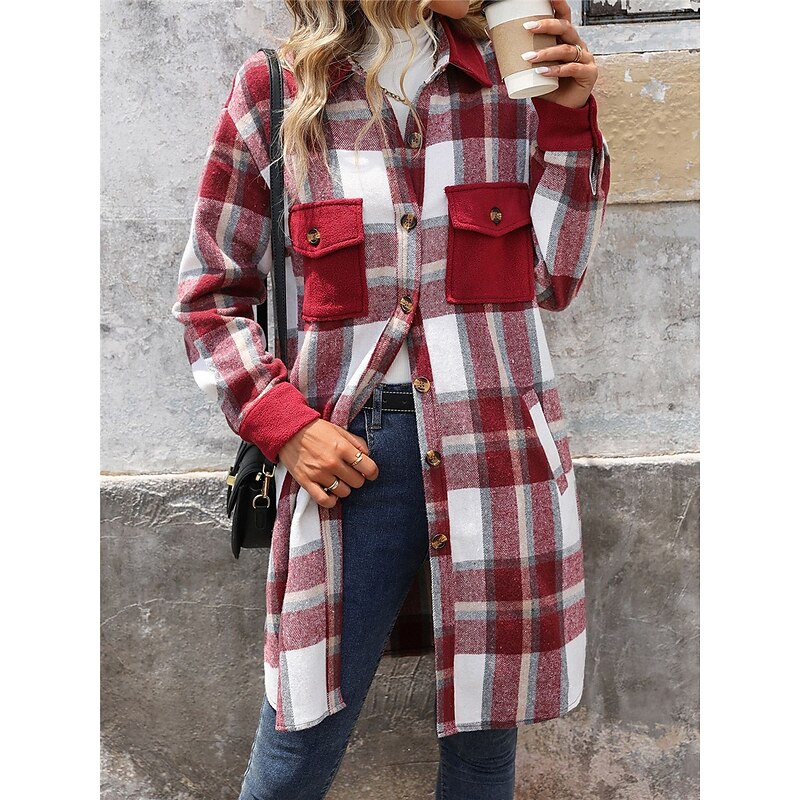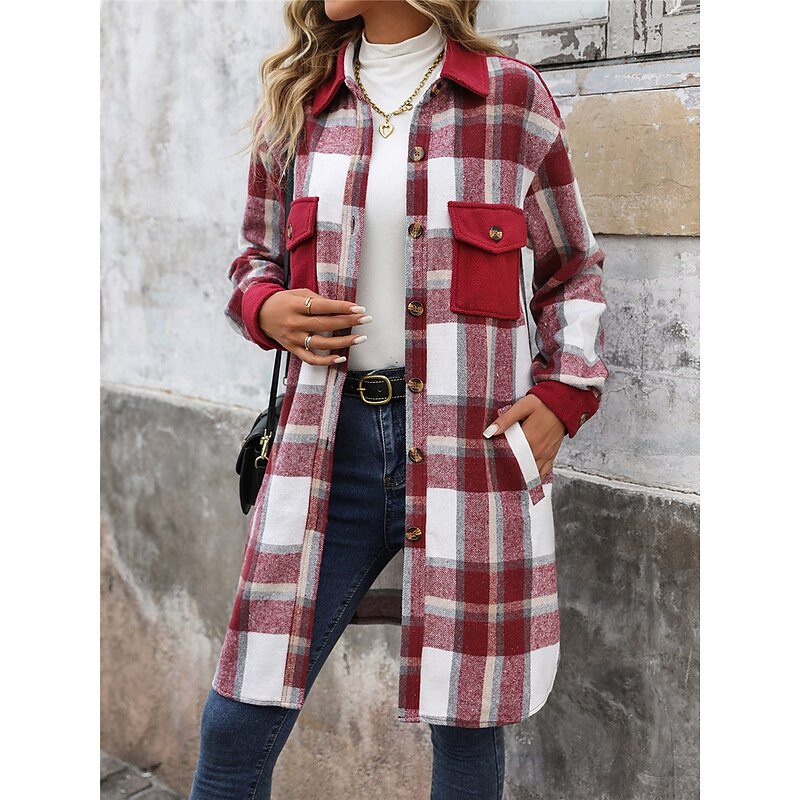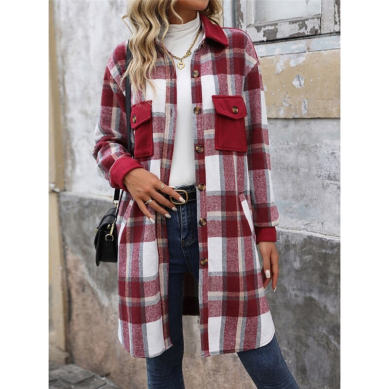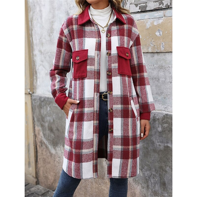 More information about Women's Winter Jacket Coat Outdoor Street Daily Wear Fall Winter Long Coat Regular Fit Thermal Warm Breathable Stylish Casual Jacket Long Sleeve Stripes and Plaid with Pockets Print Wine Coffee Gray