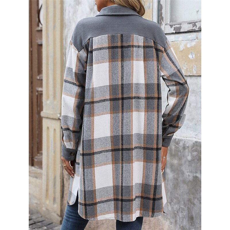 Women's Winter Jacket Coat Outdoor Street Daily Wear Fall Winter Long Coat Regular Fit Thermal Warm Breathable Stylish Casual Jacket Long Sleeve Stripes and Plaid with Pockets Print Wine Coffee Gray 11