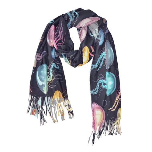 Colorful Jellyfish Cashmere Feel Scarf for Women, Single-sided Print, Fashion Pashminas Shawl Wrap Large Size with Tassels 1