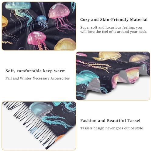 Colorful Jellyfish Cashmere Feel Scarf for Women, Single-sided Print, Fashion Pashminas Shawl Wrap Large Size with Tassels 3