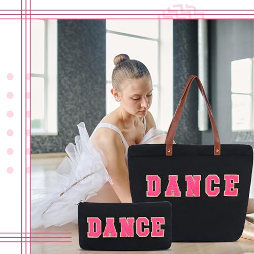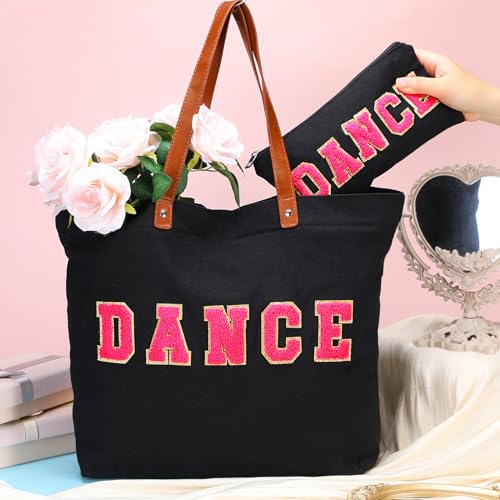 Fabric type: Canvas, chenille, leather handleOrigin: ImportedGifts for Dancer: our package includes both 1 large tote bag and 1 cosmetic bag in black color with colorful chenille letters of [DANCE]; The cosmetic bag fits properly in the tote for easy portability; This combination not only offers practicability but also presents a coordinated look, enhancing your overall style quotient, ideal gift for dance students' daily use and to give to teachers to express their gratitudeSpacious and Adaptable Sizes: the sizable dimension of this tote bag is about 21 x 15 x 5.5 inches/ 54 x 38 x 14 cm (L x H x W), making it apt to carry everyday essentials, while the cosmetic bag measuring about 8.7 x 5 x 3 inches/ 22 x 13 x 7.5 cm (L x H x W) is ideal to secure your makeup items; Not too big, not too small, they're just the right size for everyday usageQuality Material and Design: our tote bag and cosmetic bag are made from quality canvas and chenille, ensuring durability and longevity; This tote bag also features leather handles that provide a touch of sophistication, ensuring a robust and sleek carrying solution for individualsFunctional Features for Practical Usage: equipped with a convenient handle and an inner pocket with zipper, the tote is designed to meet your daily needs; The handle ensures a comfortable grip, making your journey easier while the zipper secures your belongings; The zipper of the chenille letter makeup bag also keeps your keys, lipstick and many other small items safeWidely Applicable: an essential for women, these appreciation gifts tote bag and makeup bag are widely applicable for various occasions, be it shopping, work, travel or a day out; They pocket your belongings neatly while offering a fashionable edge Perfect for everyday use. superior materials and excellent craftsmanship ensure long-lasting durability.