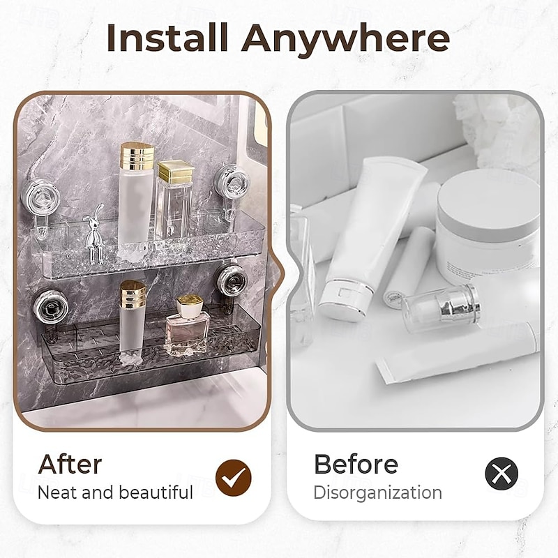 Highlights · Larger and Thicker Storage Capacity Our corner shower caddy is designed to be thicker and wider than typical drill-free bathroom shelves, providing ample space to hold shampoo, conditioner, soap, razors, and other daily shower essentials. · Drill-Free Installation with Strong Suction Cups No tools or drilling required—powerful suction cups securely attach to smooth surfaces like glass, tiles, mirrors, and metal. Easy to install, reposition, or remove without damaging your walls or leaving residue. · Reliable and Secure Hold Built with a robust design and strong adhesive, this shower organizer stays firmly in place even in humid and wet environments. Keep your shower essentials safe from slipping or falling. · Sleek Design & Space-Saving Solution The transparent and modern design blends into any bathroom decor while maximizing space in tight shower corners. Ideal for both small and large bathrooms. · Product Size & Weight Rectangular Caddy: 4.84 x 4.33 x 15.04 in / 330g Triangle Caddy: 4.72 x 12.13 in / 440g