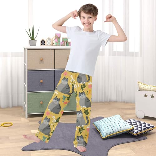 Cat Spring Florals Boys Long Pants Soft Trousers Elastic Waist Kids Lounge Bottoms with Pockets S-XL 4