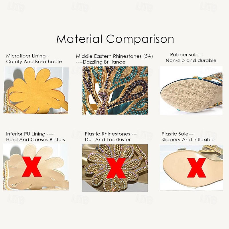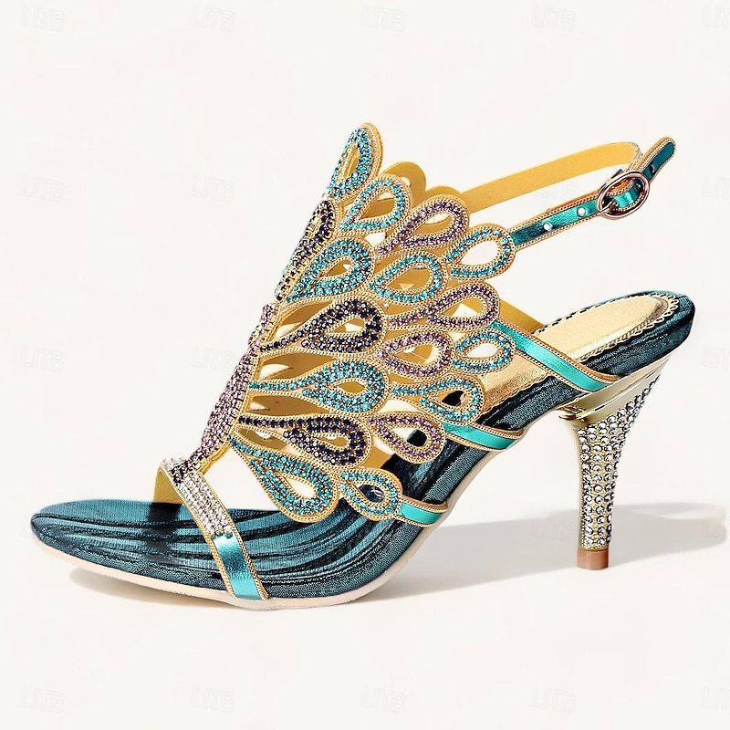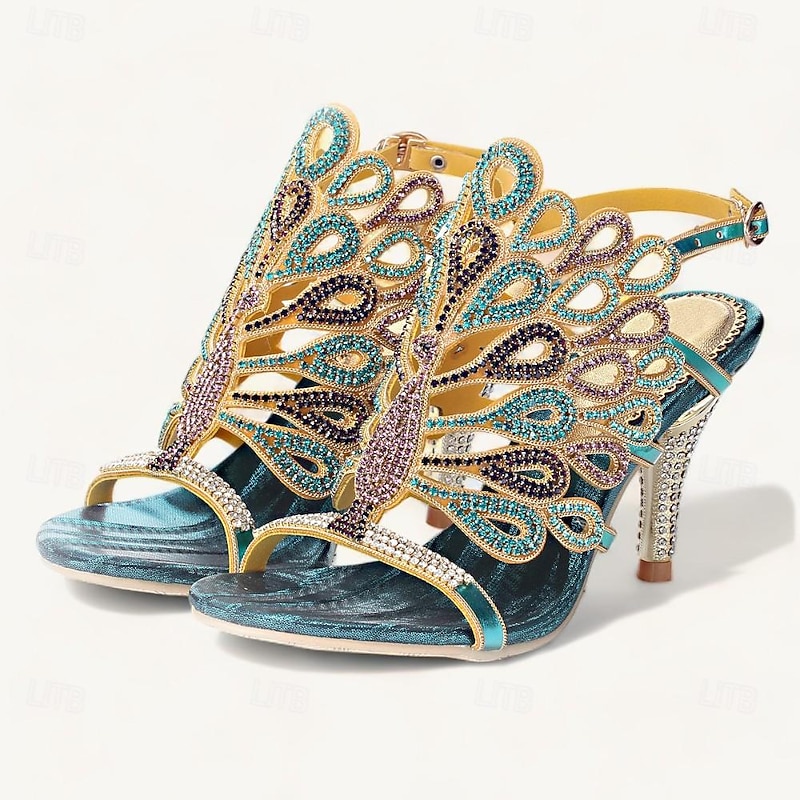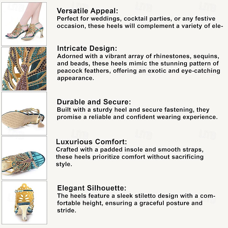 Highlights [Fabric and Materials] : These exquisite women's heels sandals are crafted from microbial leather for the upper and leather lining, ensuring durability and comfort. The rubber outsole provides a stable base, making these shoes suitable for extended wear. [Design and Style] : Featuring a peep-toe design, these chic sandals boast an intricate peacock feather pattern embellished with colorful beads and sparkling sequins. The rhinestone-adorned cone and stiletto heels add a glamorous touch, while the adjustable ankle strap ensures a secure and personalized fit. [Design Highlights] : The standout embellishments of vibrant peacock feathers and rhinestones create an eye-catching aesthetic suitable for any elegant ensemble. The combination of vintage and Bohemian styles gives these sandals a unique and timeless appeal. [Occasions] : Ideal for weddings, parties, formal occasions, and evening outings. These sandals effortlessly complement sophisticated attire, making them a versatile choice for various social gatherings. [Size Range] : Available in a wide range of sizes from US5.5 to US11, accommodating diverse foot sizes to ensure the perfect fit for every wearer.