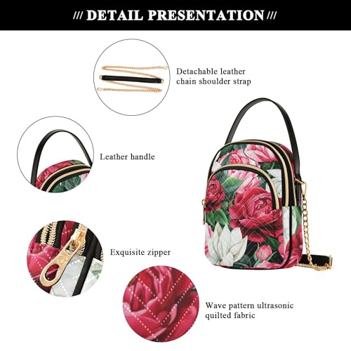 HOT ! One Shoulder Handbags White Red Pink Peonies Quilted Phone Wallet Chain Strap Purse Cute Zipper Crossbody Bowler Bag, 5.9" × 8.3" × 3.1"