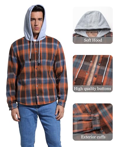 Men's Cotton Plaid Long Sleeve Shirts Jacket Fleece Lined Flannel Shirts Sherpa Button Down Coat with Hood 6