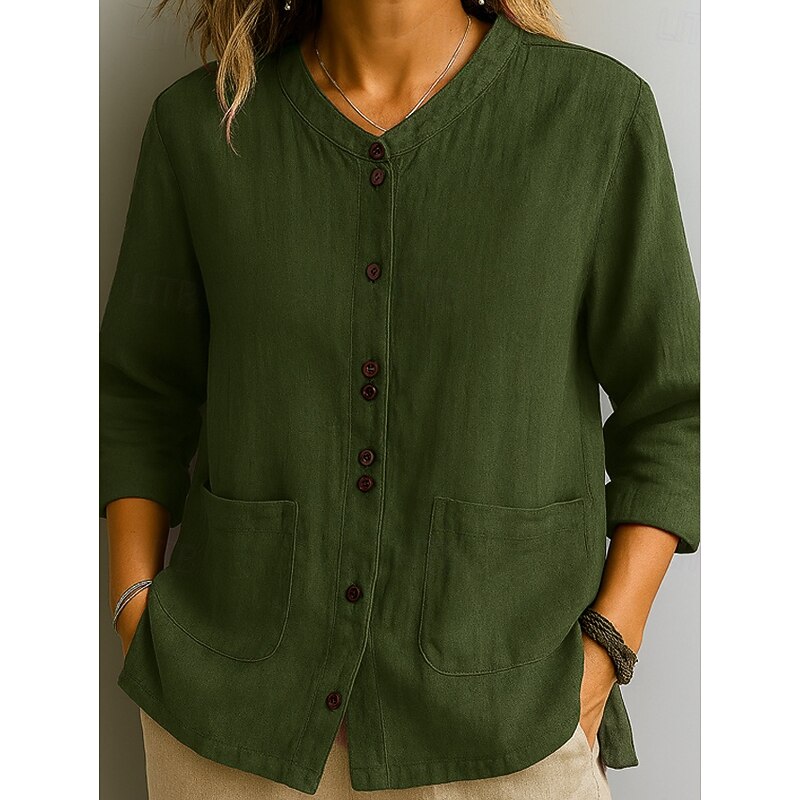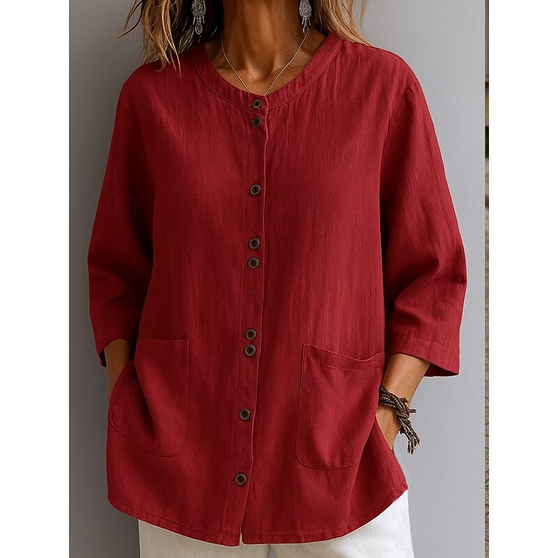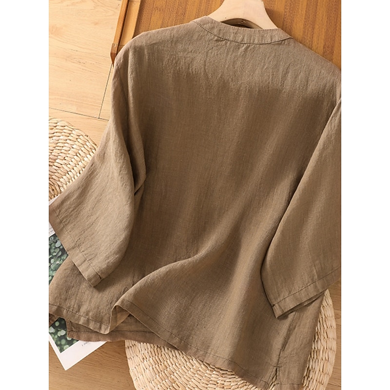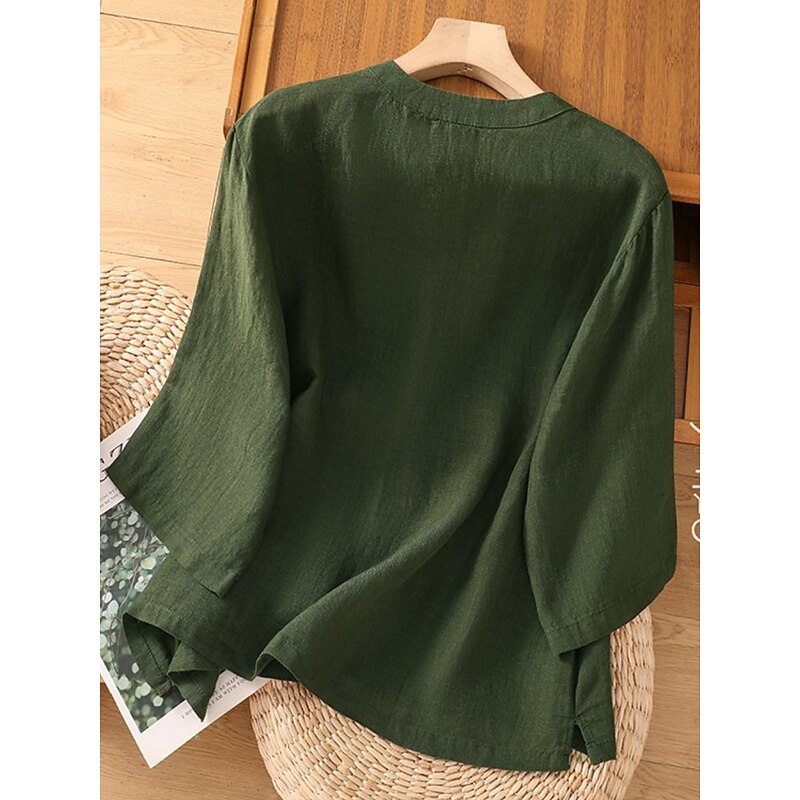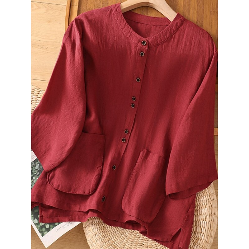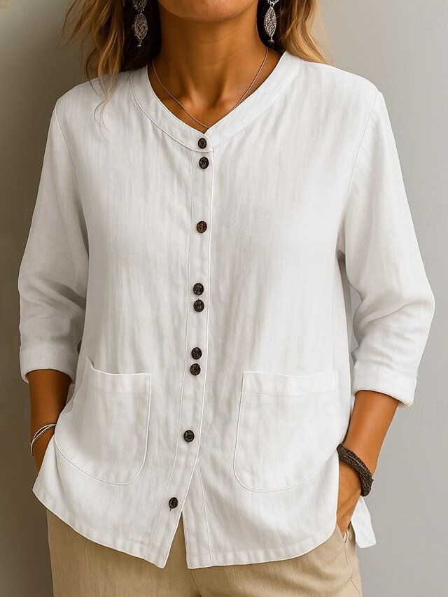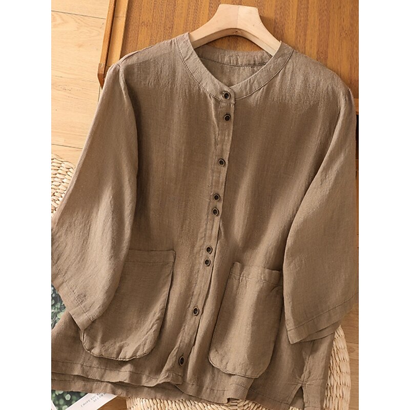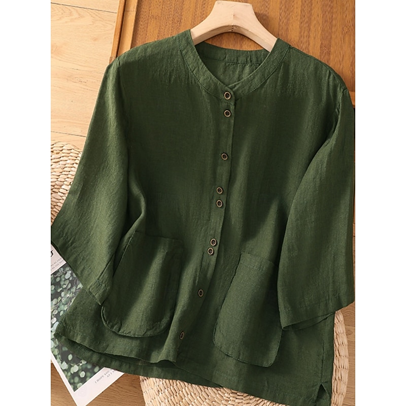 More information about Women's Cotton Linen Shirts Solid Color Basic Casual 3/4 Length Sleeve Crew Neck Regular Tops Daily Pocket Buttons White Wine Green Khaki Summer Spring Fall