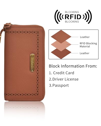Large Genuine Leather Women Wallet Bifold Purse Clutch RFID Block Card Holder Zipper Wristlet Strap for Ladies Checkbook 1