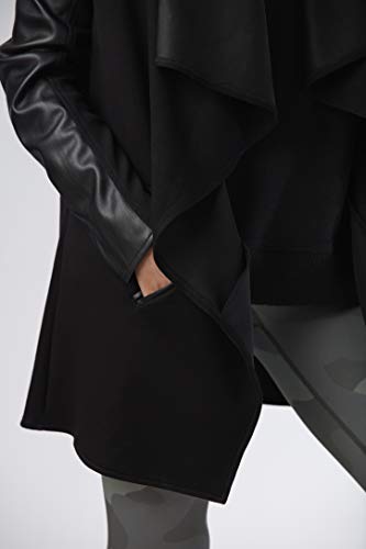 Fabric type: 51% Polyester, 42% Rayon, 7% SpandexCare instructions: Machine WashOrigin: ImportedPonte knit jacket features draped front lapel, faux leather sleeves and front pockets.Care Instructions: TURN INSIDE OUT MACHINE WASH COLD SEPARATELY GENTLE CYCLE ONLY NON-CHLORINE BLEACH WHEN NEEDED LAY FLAT TO DRYModel is 5'7 and is wearing a small.