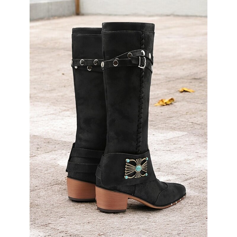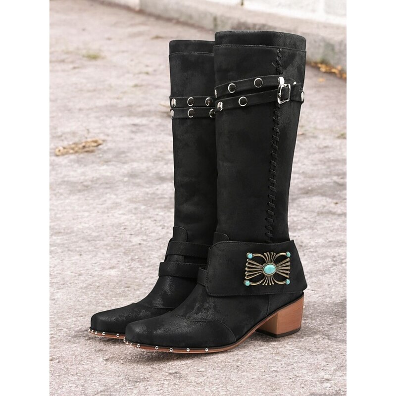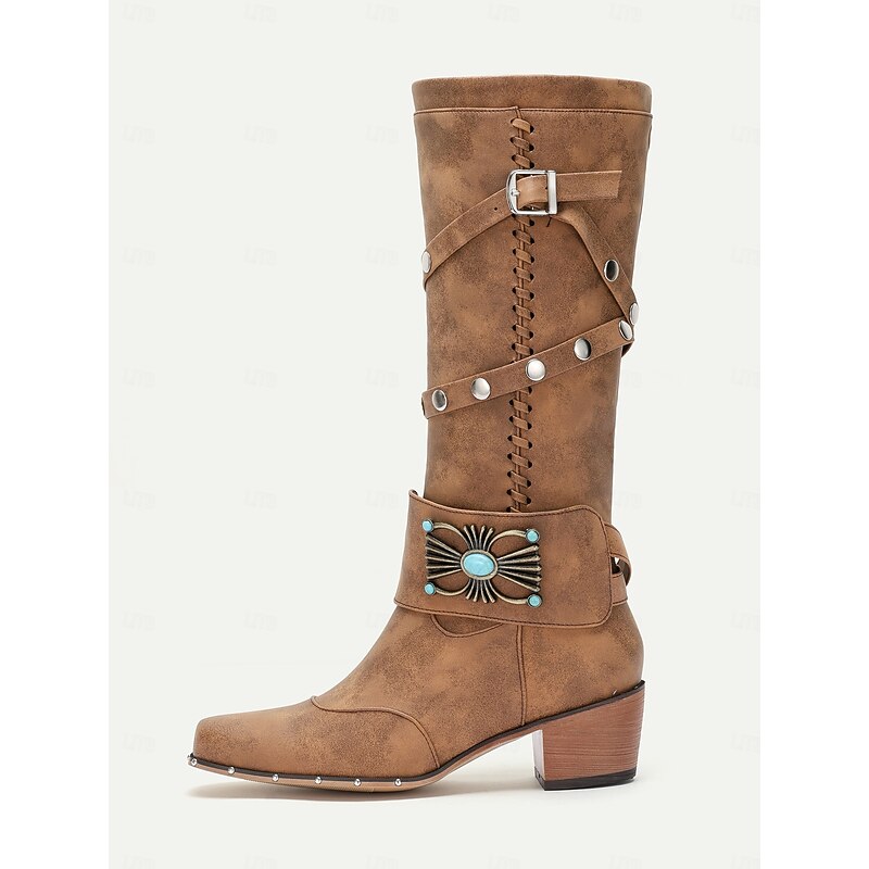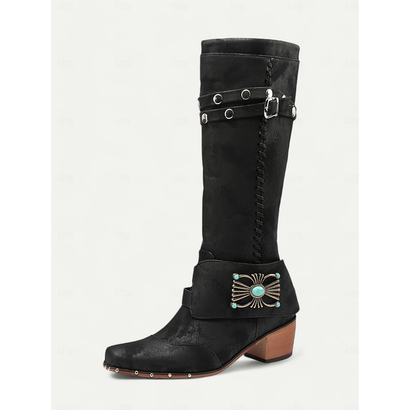 Highlights [Fabric]: Crafted from high-quality PU material, these knee-high boots offer durability with a soft-touch finish, ensuring long-lasting wear and a comfortable fit. [Silhouette]: The boots are designed with a sleek knee-high silhouette, featuring a distinctive square toe and a chunky heel that provides stability and added height, perfect for elongating the leg line. [Design Highlights]: These boots showcase intricate details like decorative metal studs and buckles for a rugged yet chic aesthetic. A standout feature is the large ornamental strap with a turquoise-colored jewel, adding a pop of color and a touch of elegance. Intricate stitching along the boots' sides enhances their unique design and texture. [Occasions]: Perfect for daily wear, work, or semi-formal gatherings, these boots blend fashion with functionality, suitable for all seasons – spring, summer, fall, and winter. Whether attending a rodeo or dressing for a country-style event, these boots are the ideal choice for adding charm and sophistication. [Size Notice]: Available in a range of sizes from US5.5/EU35/UK3.5 to US10.5/EU42/UK8.5. It's recommended to select your usual size for a standard fit, ensuring comfort and style with every step.