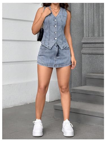 HOT ! MakeMeChic Women's Denim Vest Tops Sleeveless Button Down V Neck Asymmetrical Hem Crop Jean Vest
