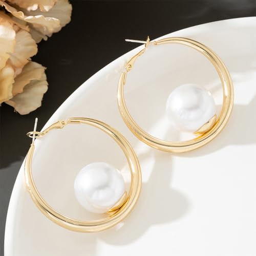 • Chunky Gold Big Pearl Drop Dangle Hoop Earrings for Women Trendy, Dainty Large Pearls Thick Round Circle Dangly Earring Exquisite Party Jewelry Gifts